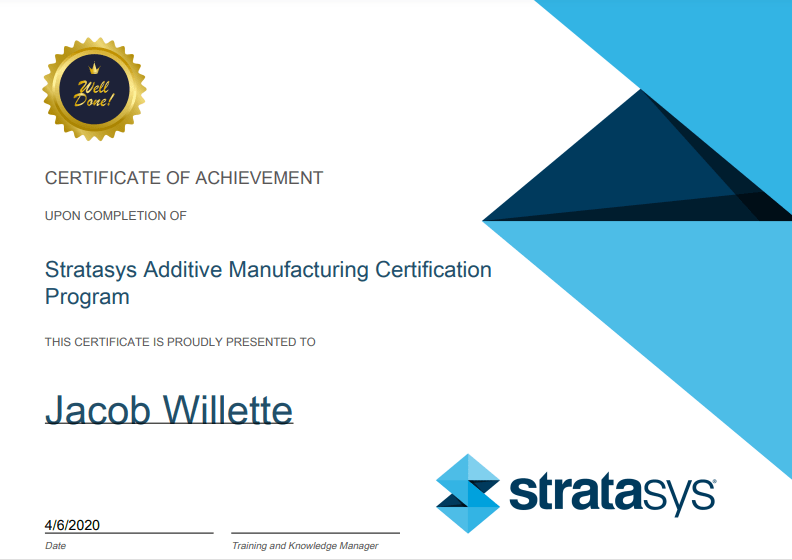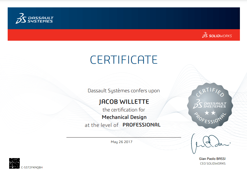 Documents and Certifications Resume jacob-willette-resume-editable.docx-1Download Solidworks Professional in Mechanical Design Certification (CSWP) Download for full document CSWPDownload Solidworks Associate in FEA Simulation (CSWA-S) Download for full document CSWA-SDownload Stratasys Additive Manufacturing Certification Download for full document StratasysDownload