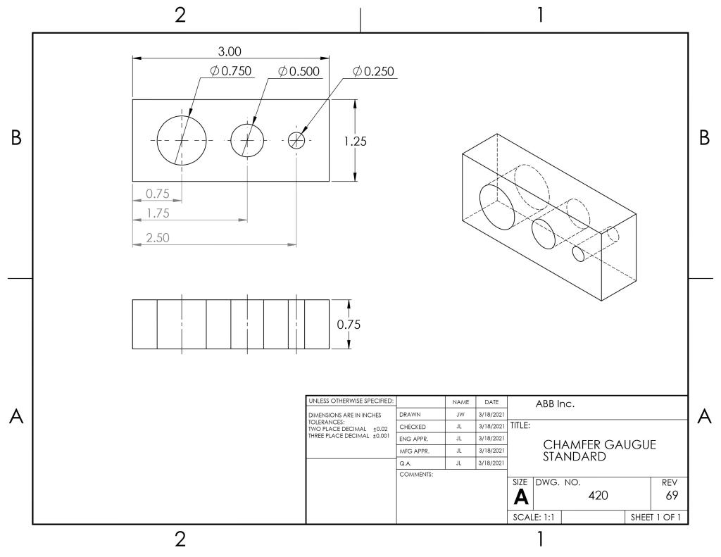 The first part I designed professionally. This standard was used to calibrate different-sized chamfer gauges at ABB Auburn. The parts were cut with wire EDM machines to maintain the necessary tolerance of one-thousandth of an inch and made of pre-hardened steel to keep from waring. When the holes eventually lose calibration, the part can be faced several times to remake the edge required for chamfer gauging.