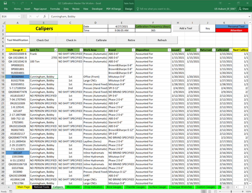 The first and most simple of my sheets at ABB Auburn was the tool calibration tracking sheet. This sheet allowed for the tracking of any number of quality tools’ calibration so that the quality department knew when they expired and where the tools were located. It also keeps track of how and when tools are retired so the department could find patterns in brands or tool owners. The first link is a standard operating procedure on how to calibrate calipers, and it has instructions on how to use the sheet.