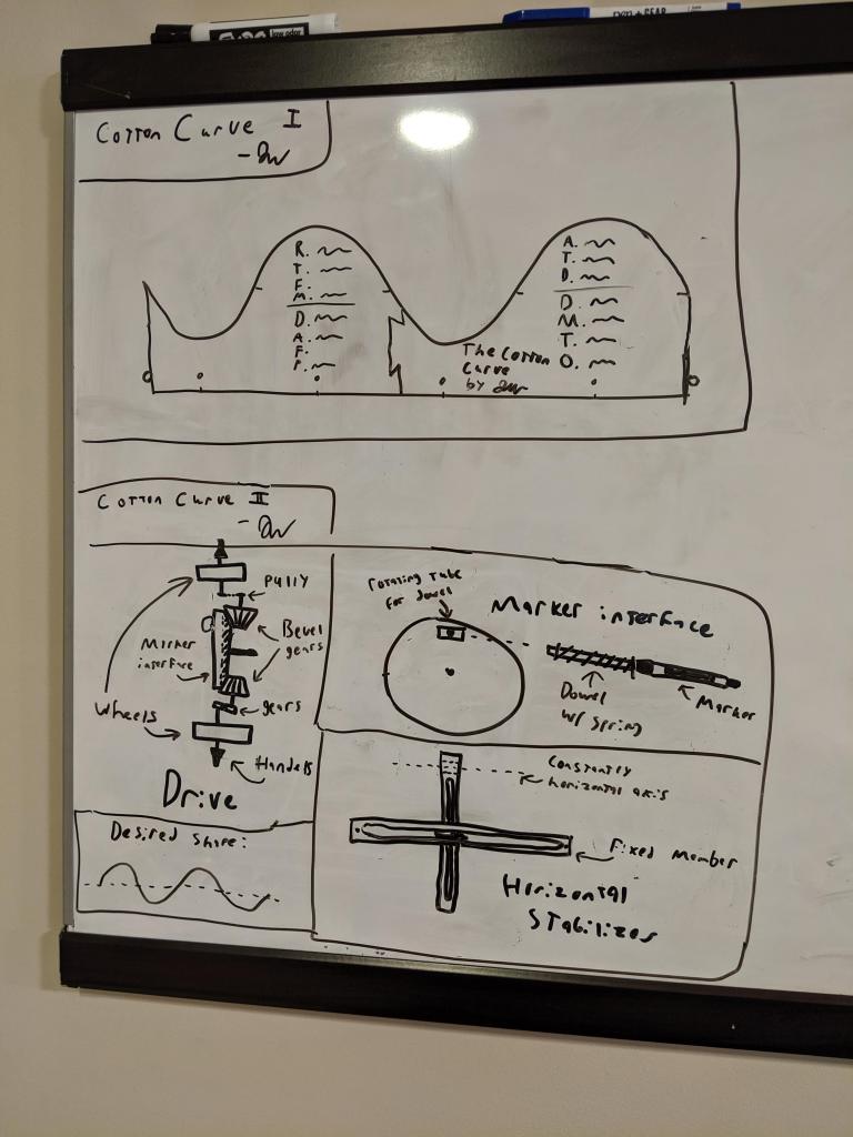 Named after my favorite professor, the Cotton Curve is a mechanical sine wave generator. It is designed to have no electronic parts and draw a sine wave of fixed amplitude with any medium on any surface. Here is a useful visualization that demonstrates how this curve is defined in three dimensions. (Forgive the crude drawing above).